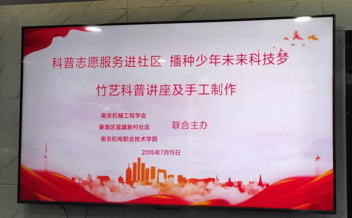 2025年7月15日,由南京机械工程学会、秦淮区蓝旗新村社区、南京机电职业技术学院3家联合主办的暑期儿童“竹艺科普讲座及手工制作课”在蓝旗新村社区开讲,近30位小学生,以及南京机械工程学会、秦淮区蓝旗新村社区、南京机电职业技术学院10多位科普服务志愿者参加。