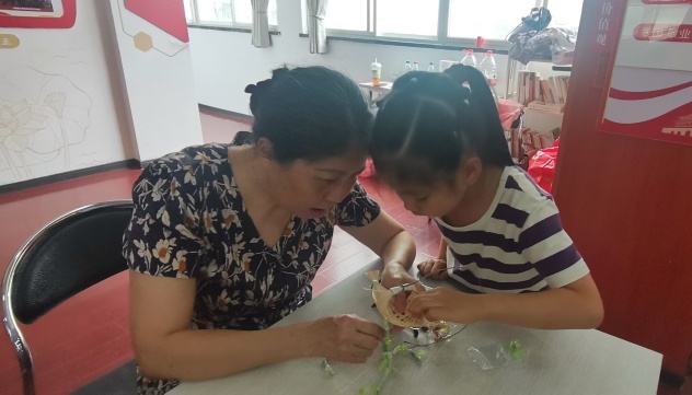 讲座结束后,张老师及科普服务志愿者们将一只只精美的竹编小舟以及一包配件发给小学生。并讲解、示范制作“竹编小舟风铃”的每一个步骤。中高年级的小学生们兴趣盎然,跟着老师讲解、示范的步骤,认真制作竹编小舟风铃。一、二年级的小学生因为年龄较小,有些跟不上老师的教学节奏,显得手忙脚乱。身旁的志愿服务者们立即上前安慰,并帮忙串线串珠。小学生们很快完成手工制作,喜笑颜开地展示着自己的作品,一堂知识丰富、生动有趣的“竹艺科普讲座及手工制作课”在集体合影后结束。