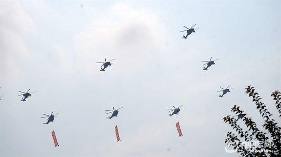9时44分,空中护旗梯队率先亮相,揭开阅兵分列式的序幕——3架直升机分别悬挂中国共产党党旗、中华人民共和国国旗、中国人民解放军军旗迎风向前,26架直升机组成巨大的“80”字样,3架直升机分别悬挂“正义必胜”“和平必胜”“人民必胜”条幅飞过天安门广场。
